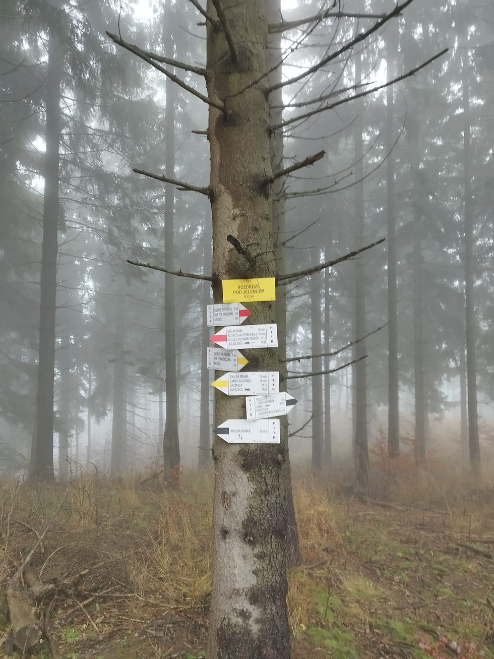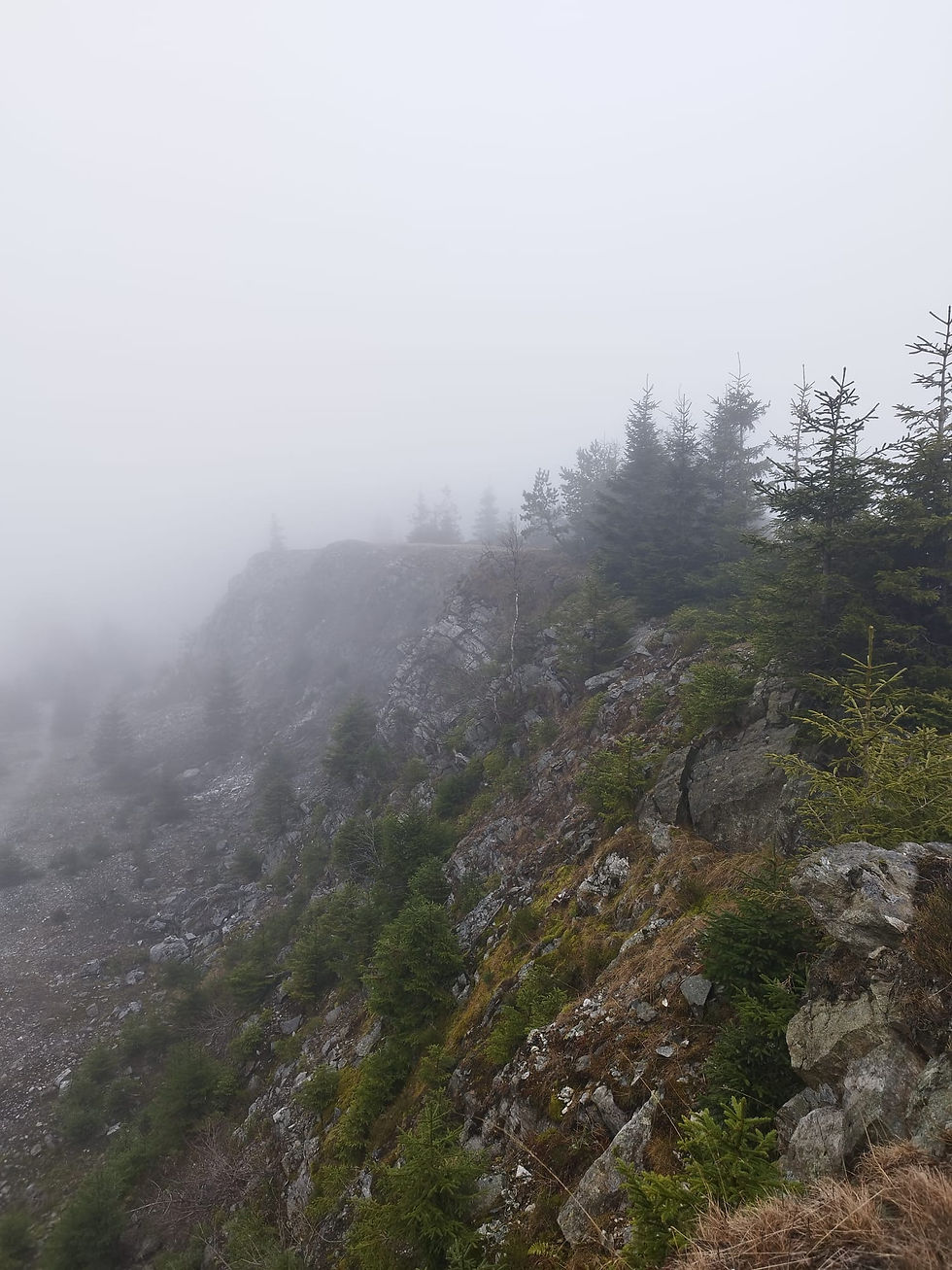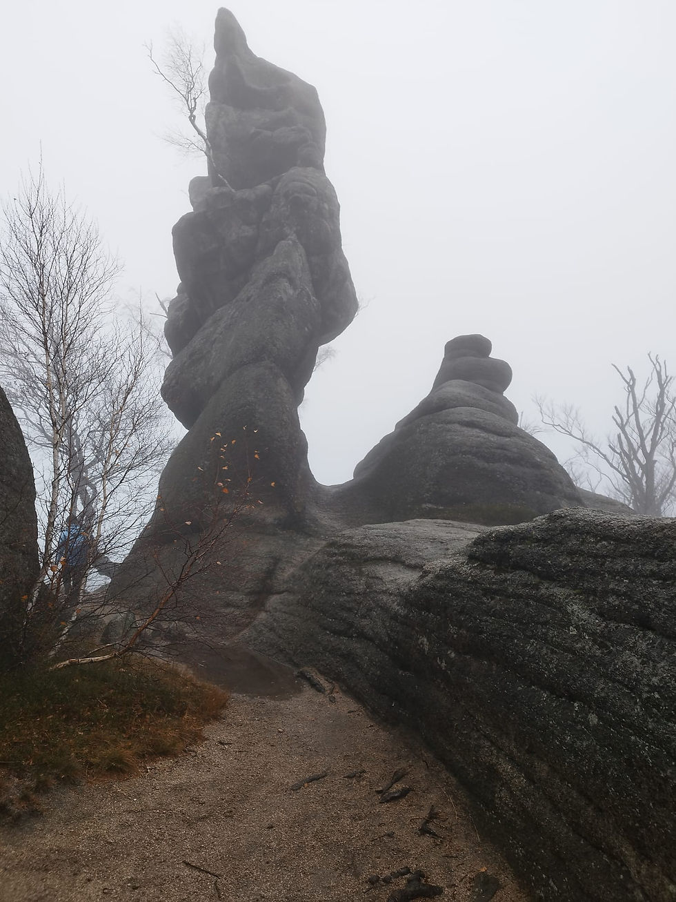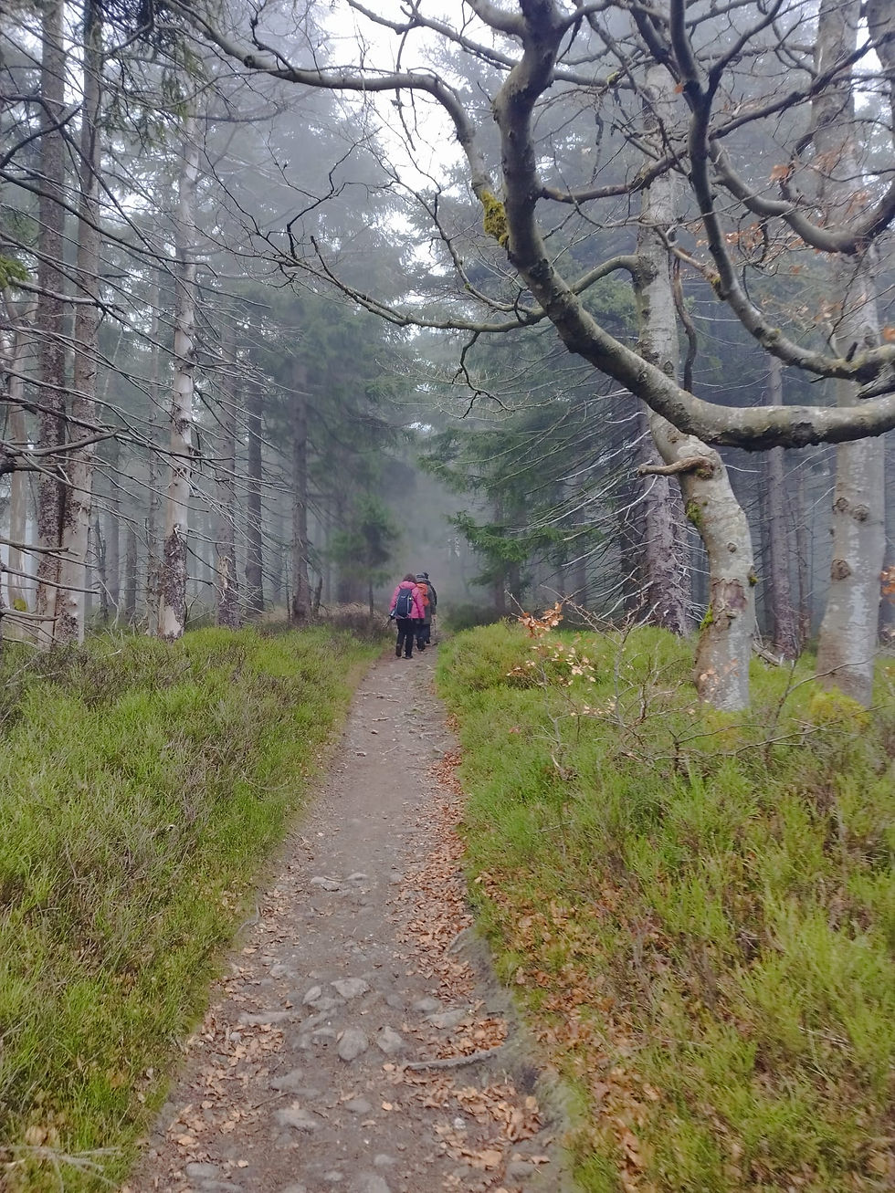 Stamtąd ruszyliśmy na Izerskie Garby, a następnie czerwonym szlakiem na Wysoki Kamień. Pięknych widoków na Karkonosze niestety nie uświadczyliśmy ze względu na mglistą pogodę, jednak przesuwające się tumany mgły mają również swój urok.