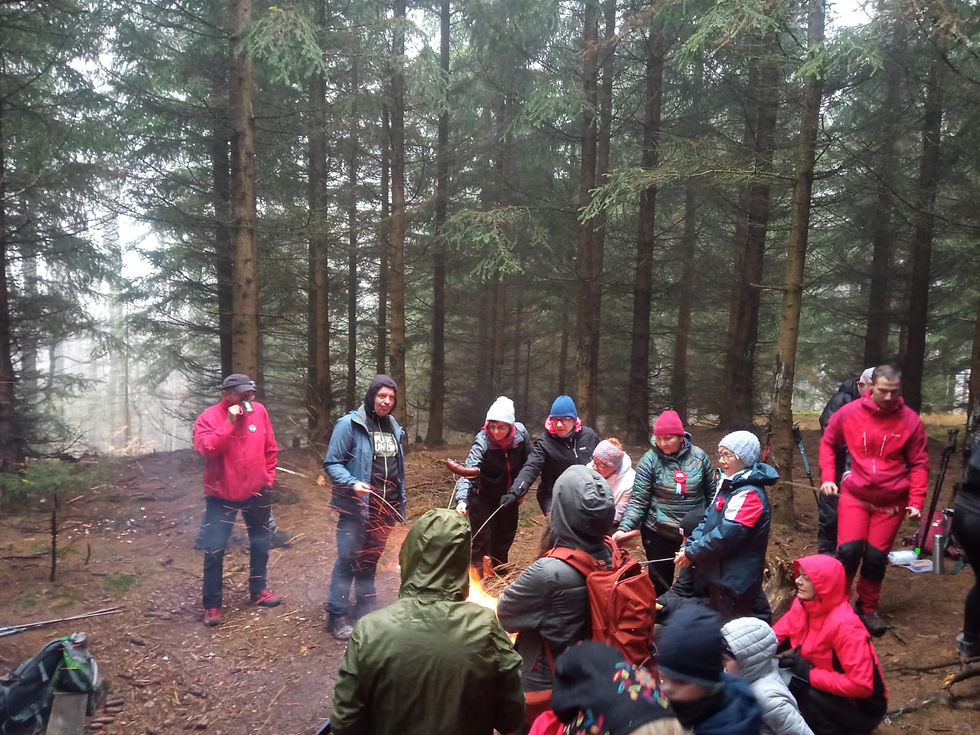 Mimo ,że pogoda nas nie rozpieszczała to jednak w wyśmienitych humorach pokonaliśmy trasę .Oczywiście było ognisko, była kiełbaska. Szukaliśmy w Szczelinach Wiatrowych odpowiedzi na pytanie,, Czy góra oddycha? Czy łapie wdech a potem wydycha powietrze?."