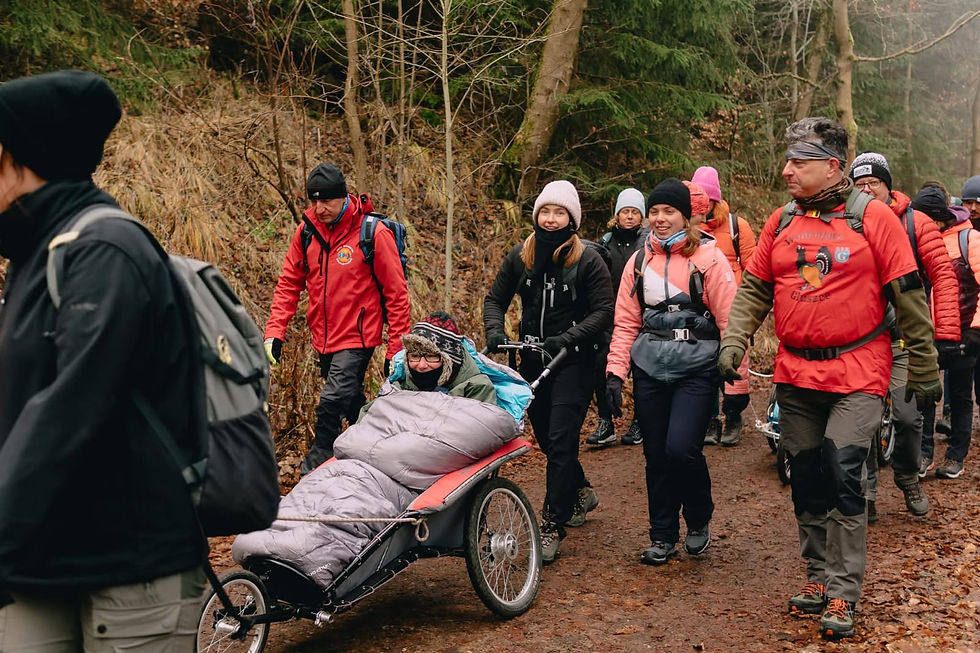 Dziś w niedzielę 14.grudnia 2025r. ekipa Wędrujących Głuszców w połączeniu z Mieroszowem w Górach i Wałbrzyskim Klubem Wędrowców wyruszyła jako wolontariusze na szlak z Osobami z Niepełnosprawnością na górską wędrówkę. To już nasze kolejne takie spotkanie z fundacją Łączą nas Góry i Ładne Historie, bo to właśnie oni w ramach zakończenia sezonu zorganizowali wycieczkę tym razem w Górach Suchych z Przełęczy Trzech Dolin trasą wokół Waligóry.... Najpierw spotkanie w schronisku Andrzejówka w oczekiwaniu na przyjazd uczestników... Pogoda klimatyczna jak przystało na to miejsce rześko, mgliście,, klimatycznie...ale to nie przeszkadzało żeby wyruszyć i wesprzeć Was na tarasie pchając lub ciągnąć wózek....co prawda mgła nie pozwoliła na widoki i panoramy ale to w niczym nie przeszkadzało. W tempie prawie wyścigowym pokonane 5 km zostało bez przeszkód